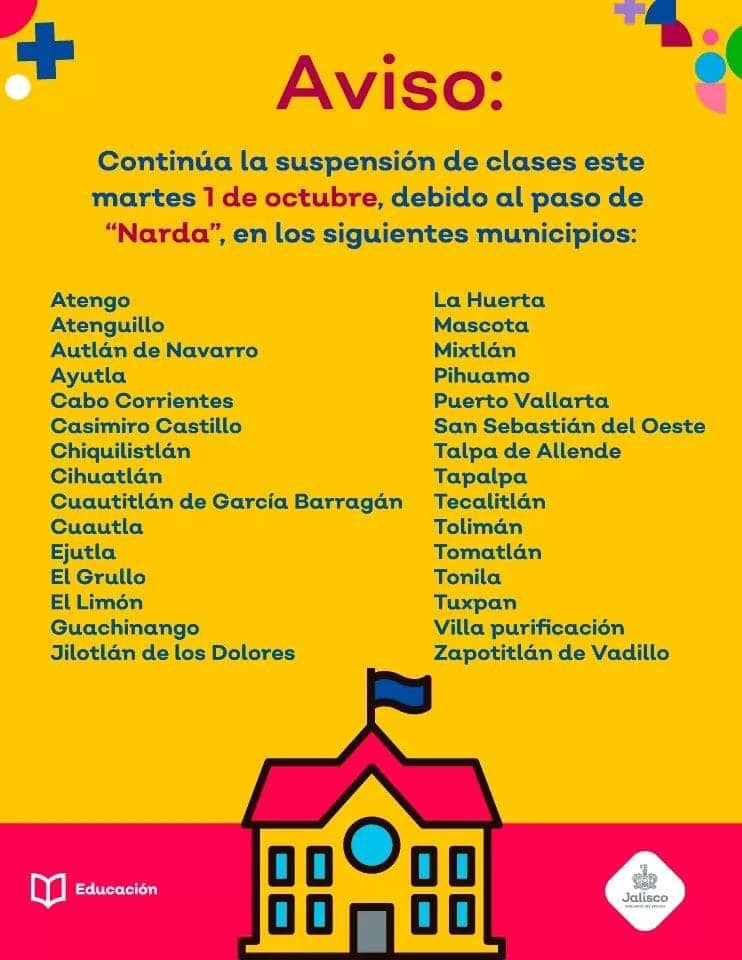 La suspensión de clases es para todos los planteles educativos del sistema básico; preescolar, primaria y secundaria, que se encuentren en estos 30 municipios, así como los planteles del Sistema de Educación Media Superior y la Universidad de Guadalajara.
