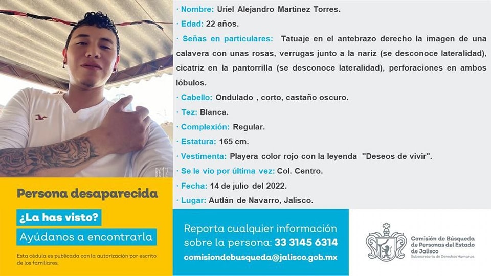 La Comisión de Búsqueda de Personas del Estado de Jalisco (Cobupej) precisó que aún realizan acciones para su localización, sin éxito alguno. La ficha difundida por esta dependencia precisa que el joven tiene 22 años de edad.