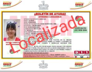 A través de la Alerta Amber se inició un proceso de búsqueda, que culminó con la aparición de la menor esta tarde. Por: Ángeles Claustro El Grullo, Jalisco.-11 de marzo del 2021.-(Letra Fría) Fátima Yaretzi Ruíz Hernández ya fue localizada y se