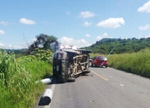La carretera federal 80 Guadalajara - Barra de Navidad fue escenario de una volcadura; en el kilómetro 124 una camioneta pick up blanca que transportaba 15 cilindros de gas LP volcó. Elementos de la Unidad Municipal de Protección Civil y Bomberos