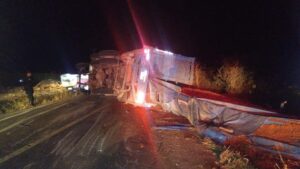 Este martes, se volcó un tractocamión que transportaba aserrín. El percance ocurrió a las 20:00 horas, en el kilómetro 120 de la carretera federal 80, a la altura del “Hotel Texas”, informó la Coordinación Municipal de Protección Civil de Unión de Tula.