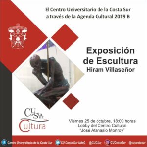 Este viernes 25 de octubre a las 18:00 horas, el Centro Universitario de la Costa Sur, a través de la Agenda Cultural 2019-B, presentará la Exposición de Escultura de Hiram Villaseñor, en el lobby del Centro Cultural “Atanasio Monroy”.