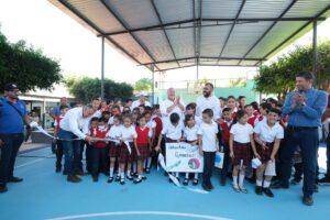 La rehabilitación de la escuela "Prisciliano Sánchez" en Ejutla incluyó la construcción de nuevas áreas como un desayunador, cancha de futbol, área de ejercitadores y juegos infantiles, así como reparación de aulas, baños, comedor y bodegas.