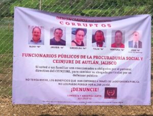 Seis funcionarios públicos de la Procuraduría Social del Estado de Jalisco y del Centro Integral de Justicia Regional Costa Sur (CEINJURE Autlán) son señalados por presuntos actos de corrupción. La mañana de este jueves alrededor de las 10:00 a.m. fue colocada una