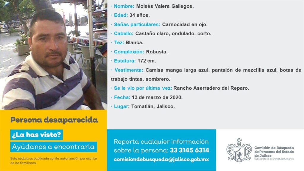 La Comisión de Búsqueda de Personas del Estado de Jalisco activó el protocolo para localizar a Moisés Valera Gallegos de 34 años de edad quien desapareció en el municipio de Tomatlán el 13 de marzo de 2020.