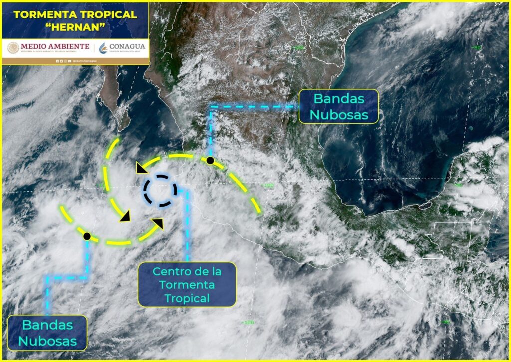 La Unidad Estatal de Protección Civil y Bomberos Jalisco (UEPCBJ) informó que, hasta el último corte de las 13:00 horas, el centro de la Tormenta Tropical "Hernan" se localiza a 120 kilómetros al suroeste de Cabo Corrientes, en la costa sur de