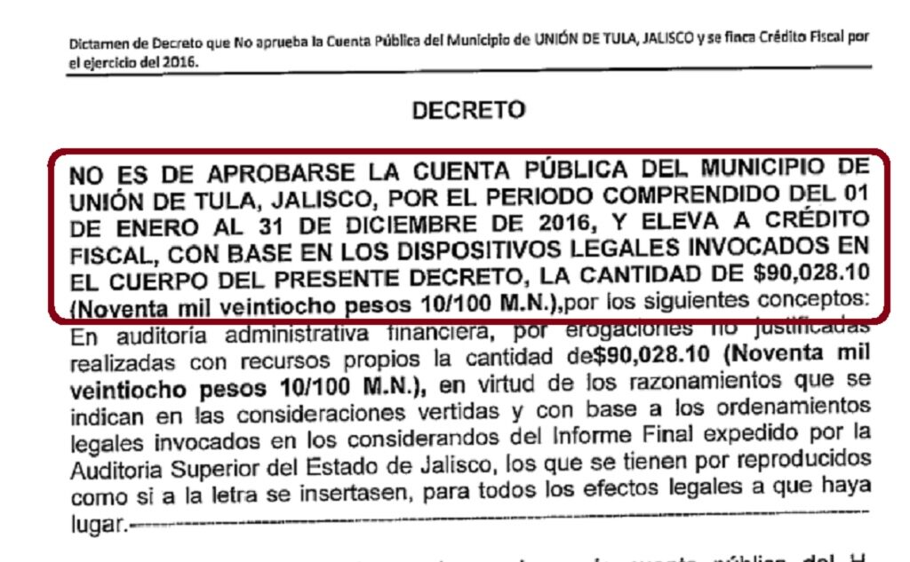 La Comisión de Vigilancia y Sistema Anticorrupción de la LXII Legislatura del Congreso del Estado de Jalisco rechazó la cuenta pública del municipio de Unión de Tula y le fincó un crédito fiscal por el periodo comprendido entre el 01 de