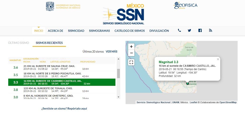 El Servicio Sismológico Nacional (SSN) registró un sismo de 3.3 grados en la escala de Richter. El movimiento telúrico ocurrió a las 00:18:55 horas de este martes a 16 kilómetros al suroeste de Casimiro Castillo, a una profundidad de 32 kilómetros.