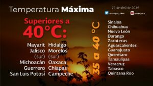La persistente onda de calor que tiene efectos en la mayor parte de México generará ambiente de caluroso a muy caluroso en la mayor parte del país, con temperaturas superiores a 40 grados Celsius en zonas de Nayarit, Michoacán, Guerrero, San Luis
