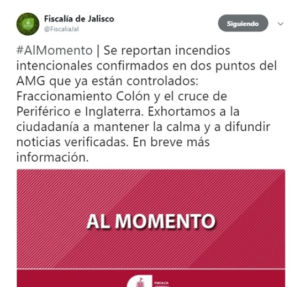 A las 21:30 horas, la Fiscalía General del Estado de Jalisco publicó en su cuenta oficiar de Twitter el siguiente comunicado: