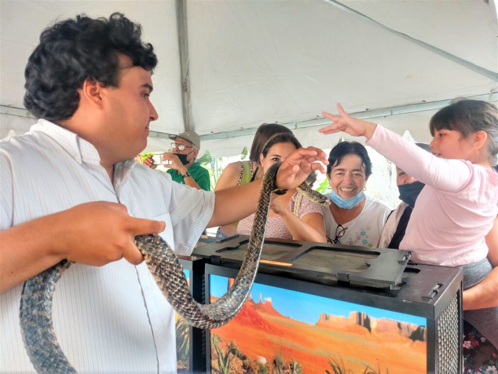 Formados en una larga y serpenteante fila, decenas de niñas, niños, adolescentes y adultos, esperaban ansiosos su turno para ingresar a la "Exposición viva de serpientes" que fue instalada la mañana de este sábado, en el Jardín Hidalgo, en el municipio de