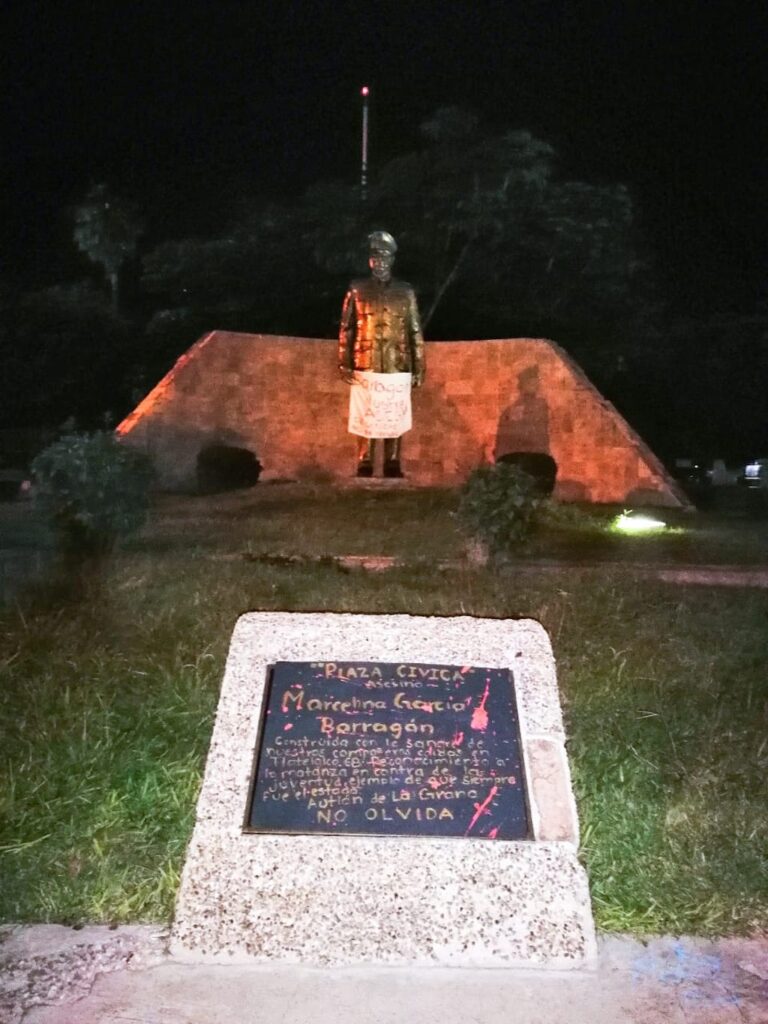 Durante la noche de este viernes la estatua de Marcelino García Barragán, ubicada en la Plaza Cívica de Autlán de Navarro, fue intervenida en alusión a su responsabilidad en la matanza de Tlatelolco.