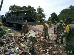 Un oficial y 20 elementos de tropa del 102 Batallón de Infantería de la Secretaría de la Defensa Nacional (Sedena), retiraron tres metros cúbicos de desechos que obstruían el paso del agua en el canal que se encuentra en la Delegación de