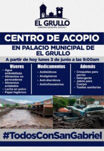 El gobierno municipal de El Grullo activó este lunes centro de acopio en apoyo a la población de San Gabriel. Se recibirán medicamentos, alimentos no perecederos, comida para mascotas, entre otros.
