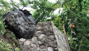 Este fin de semana, 15 elementos de la empresa “VISE”, culminaron el muro de contención que evitaría un nuevo desplazamiento de la roca gigante ubicada en la colonia “El Cerrito”, específicamente en el área privada de Los Arquitos, la cual pone