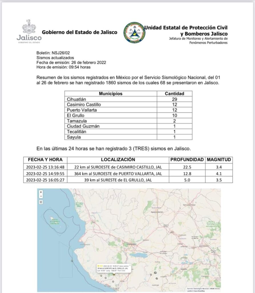Por: Lauro Rodríguez Cihuatlán, Jalisco. 26 de febrero de 2023.- (Letra Fría) La Unidad Estatal de Protección Civil Jalisco informó que, en lo que va de febrero, en el estado se han presentado un total de 68 sismos, la mayoría, en la