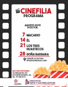 La Casa de la Cultura Efraín González Luna de Autlán, será sede de los miércoles de “Cinefilia”, en este mes de agosto, proyectando diferentes películas clásicas del cine mexicano a las 20:00 horas. “Macario”, será la primera película que se proyectará este