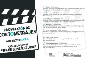 Por: Redacción. Autlán de Navarro, Jalisco (LF).- Este jueves 8 de agosto a las 20:00 horas en la Casa de la Cultura Efraín González Luna de Autlán, se proyectarán siete cortometrajes. “Duelo” será el primero en proyectarse, cuya sinopsis describe que el