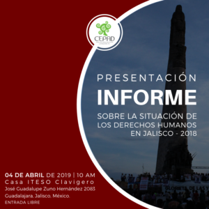 El Centro de Justicia para la Paz y el Desarrollo A.C. (Cepad) presentará el “Informe sobre la Situación de los Derechos Humanos en Jalisco 2018” el jueves, 4 de abril a las 10:00 horas en Casa Iteso Clavigero (José Guadalupe Zuno Hernández