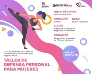 Por: Redacción Autlán de Navarro, Jalisco. 14 de marzo de 2019 (Letra Fría).- El Instituto Municipal de la Mujer en Autlán (IMMA), invita a las mujeres mayores de 10 años de edad a inscribirse de manera gratuita al taller de defensa personal.