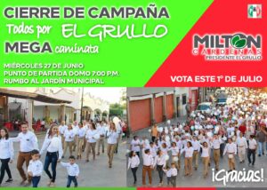 El candidato a la presidencia municipal de El Grullo por el Partido Revolucionario Institucional (PRI), Milton Carlos Cárdenas Osorio cerrará su campaña este miércoles 27 de junio, en punto de las 7:00 de la tarde, con la "Mega Marcha Todos por El