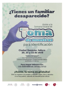 Por: Redacción Zapotlán el Grande, Jalisco. 13 de abril de 2018. (Letra Fría). – ¿Tienes un familiar desaparecido? este próximo 20, 21 y 22 de abril en el Centro de Salud no.1 (Avenida Constituyentes #162, Colonia Constituyentes en Ciudad Guzmán) de 9:00 a