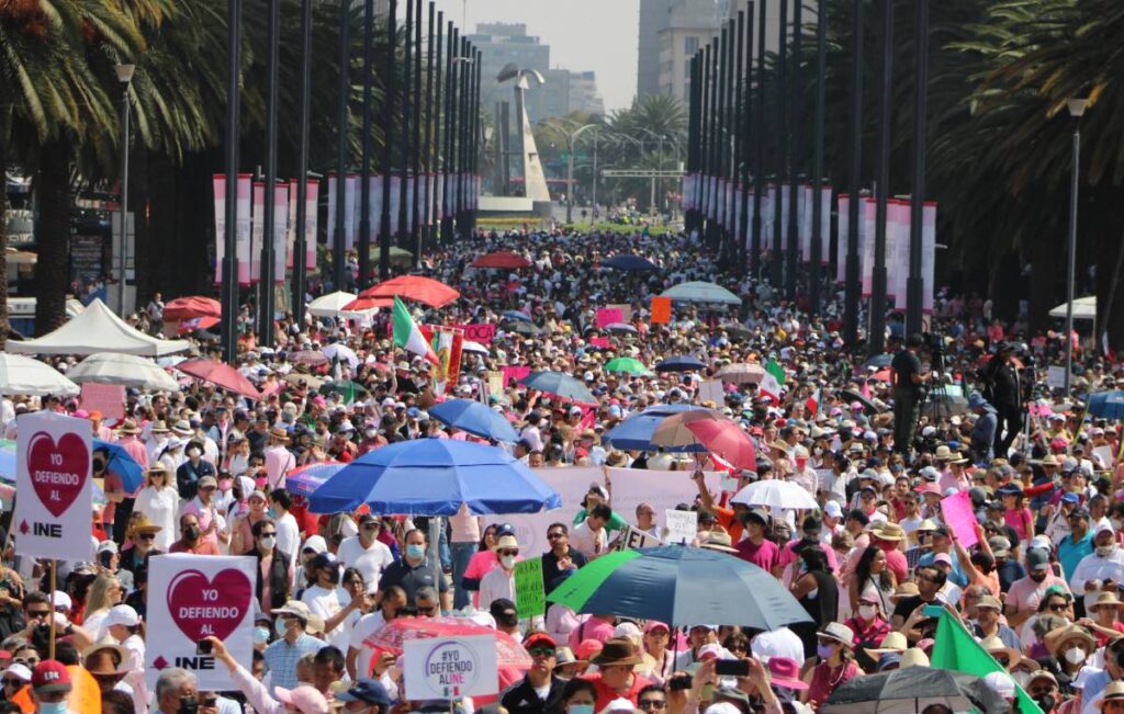 La fuente danzarina soltó un chorro de agua sobre las personas que llegaron al Monumento de la Revolución. Los contingentes vestidos de rosa y blanco con pancartas en mano