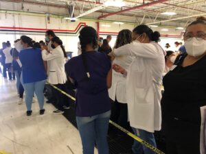 La inmunización antiCovid a todas las personas mayores de 18 años arrancó en Ciudad Juárez, en un intento de lograr la reapertura completa de la frontera terrestre con Estados Unidos; miles de personas reciben la dosis en su centro de trabajo. Por:
