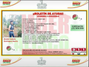 La Fiscalía del Estado de Jalisco activó la Alerta Amber para localizar a la joven Brenda Yackelin Domínguez Huerta, de 14 años de edad, quien fue vista por última vez en el centro de Ayutla.