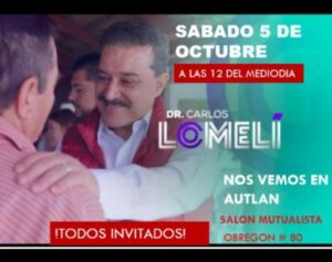 Este sábado 5 de octubre, el excandidato a la gubernatura de Jalisco por Morena, el Dr. Carlos Lomelí, visitará la ciudad de Autlán de Navarro a las 12 del día en el Salón Mutualista. El exsuperdelegado en Jalisco renunció a su cargo
