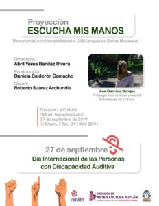 La Dirección de Arte y Cultura de Autlán invita a la ciudadanía a asistir a la proyección del documental Escucha mis manos, realizado por el colectivo Medraa con motivo del Día Internacional de las Personas con Discapacidad Auditiva. La proyección tendrá lugar