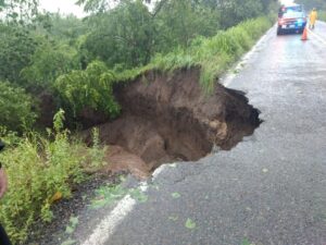 Las intensas lluvias en la región a causa del huracán “Lorena” han ocasionado un socavón en la carretera 80 Santa Cruz-Melaque, en el kilómetro 253+350.