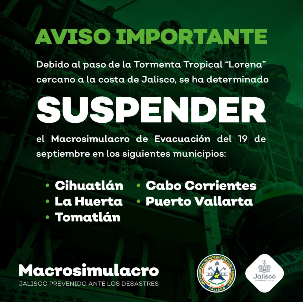La tormenta tropical “Lorena” que lleva su curso cercano a las costas de Jalisco provoca la suspensión del Macrosimulacro de Evacuación del 19 de septiembre en cinco municipios de Jalisco, informó la Unidad Estatal de Protección Civil y Bomberos de Jalisco del
