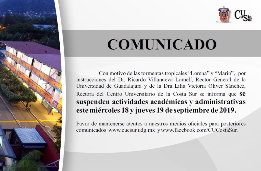 El Centro Universitario de la Costa Sur, de la Universidad de Guadalajara, suspende actividades debido a las tormentas tropicales "Lorena" y "Mario". Durante lo que resta de este miércoles y mañana jueves 19 de septiembre se suspenden las actividades académicas y administrativas.