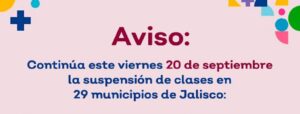 A través de su cuenta oficial de Facebook, la Secretaría de Educación Jalisco informa a la comunidad educativa que este viernes continúa la suspensión de clases para las escuelas de nivel básico y medio superior.