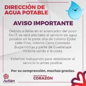 La Dirección de Agua Potable en el Ayuntamiento de Autlán informó que debido a fallas en el arrancador del pozo número 13 se verá afectado el servicio de agua potable en algunas zonas del municipio.