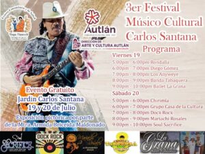 Este viernes 19 y sábado 20 de julio, en el jardín de la colonia Echeverría se llevará a cabo el tercer Festival Músico Cultural Carlos Santana, evento que se realiza en el marco del cumpleaños del famoso guitarrista de origen autlense.