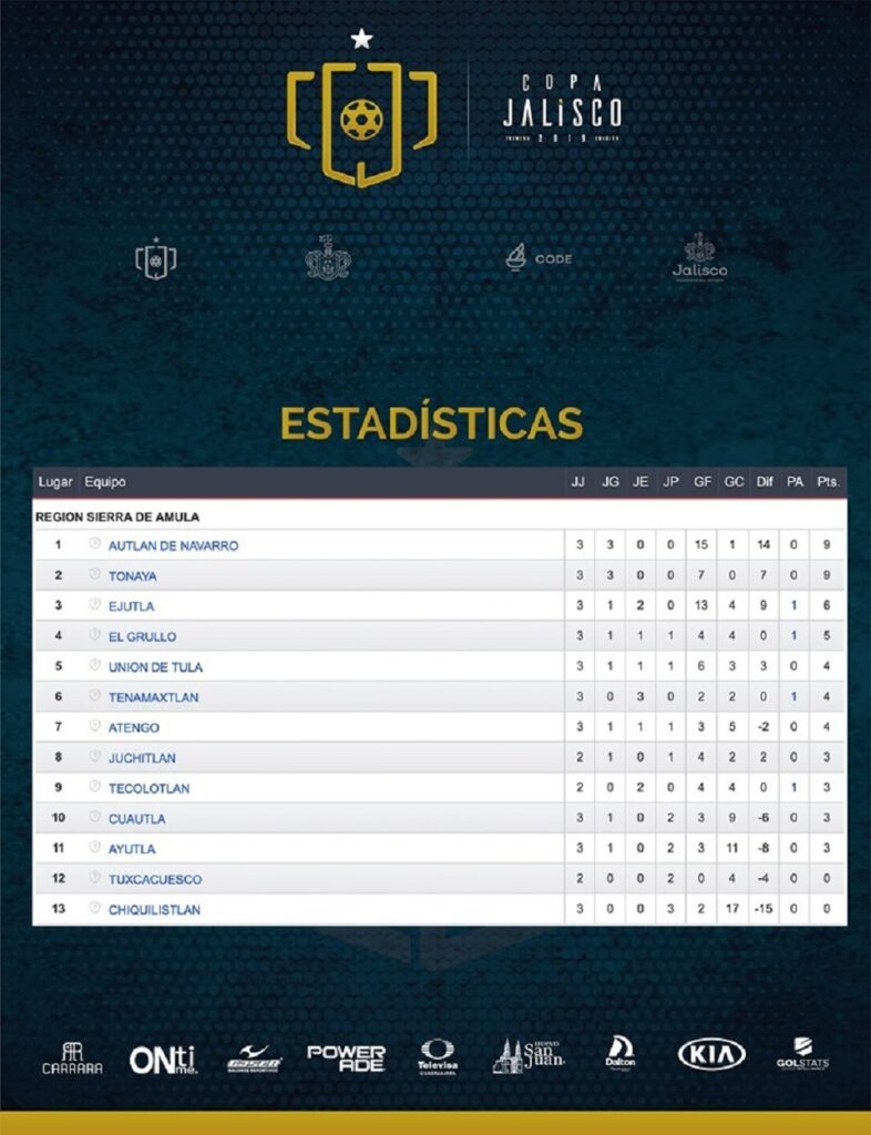 Con nueve puntos, la selección de Autlán se ubica en el primer lugar de la tabla de posiciones de la región Sierra de Amula, luego de ganar los tres partidos de las tres fechas que lleva esta primera edición de la Copa
