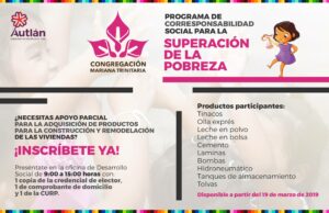 El Ayuntamiento de Autlán junto con la congregación Mariana Trinitaria, institución privada de asistencia social convocan a la población autlense a participar en la convocatoria para apoyar parcialmente a las familias en la adquisición de productos para la construcción y remodelación de