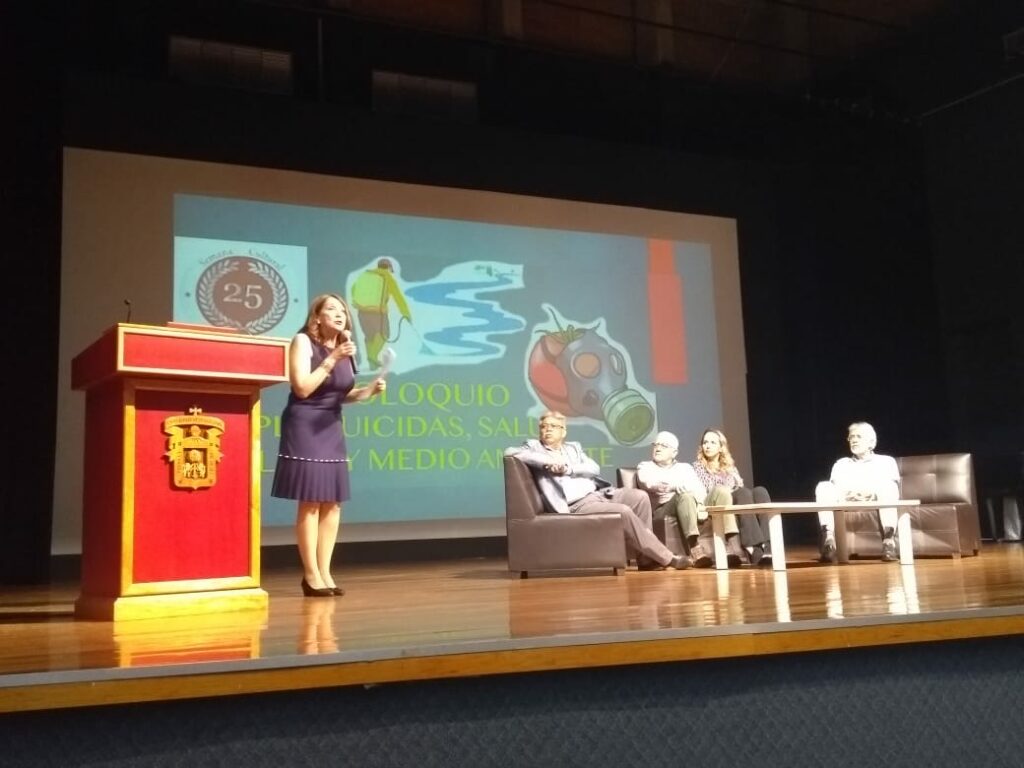 Durante el coloquio “Plaguicidas, salud pública y medio ambiente” la rectora del Centro Universitario de la Costa Sur, Lilia Victoria Oliver Sánchez, leyó un posicionamiento por la situación de la presencia de plaguicidas en la orina de niños, niñas y adolescentes en