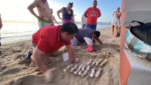 Cihuatlán, Jalisco.- Integrantes del Grupo Ecobana, este domingo primero de febrero atendieron un reporte hecho por el presidente municipal de Cihuatlán, Polo Pelayo, sobre el desove de una tortuga golfina en la playa de Barra de Navidad.