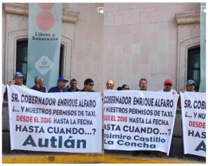 Taxistas de la Costa Sur continúan manifestándose en contra del gobernador de Jalisco, Enrique Alfaro Ramírez, así como de su gobierno. Desde 2018, 28 choferes de la Costa Sur debieron haber recibido taxis que les fueron concesionados por la Secretaría de Transporte.
