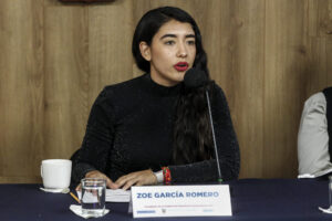 La presidenta de la Federación de Estudiantes Universitarios (FEU), Zoé Elizabeth García Romero, alienta a la comunidad del Centro Universitario de la Costa Sur (CUCSur) con sede en Autlán de Navarro, a expresarle sus proyectos, problemas y/o necesidades. La representante de la
