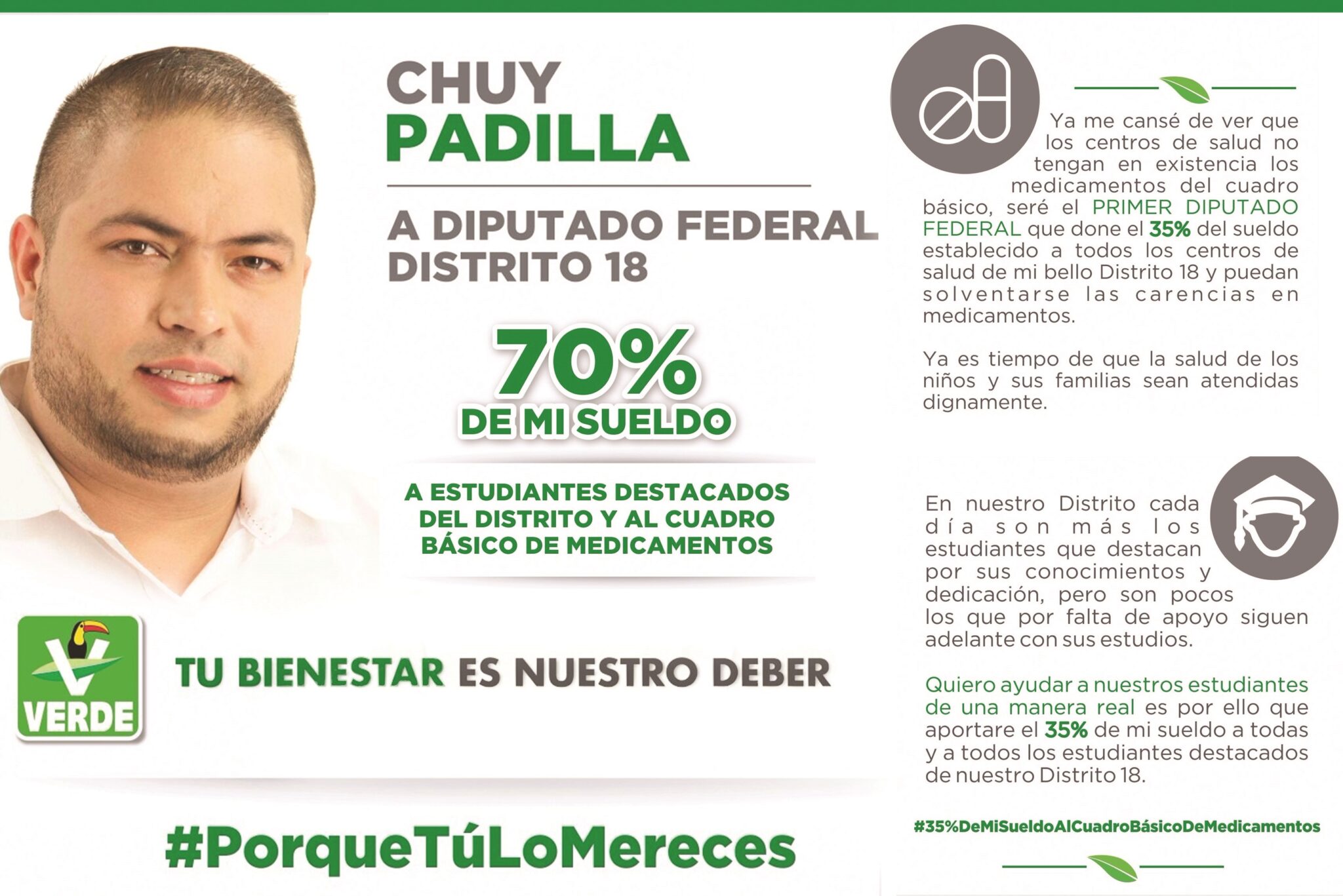 Autlán, Jalisco. 27 de junio de 2018. (Letra Fría); El candidato a la Diputación Federal en el Distrito Electoral 18 por el Partido Verde Ecologista de México, Chuy Padilla, donará el 70 por ciento de su sueldo a estudiantes destacados y a la compra del cuadro básico de medicamentos: