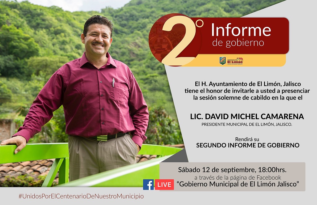 El Limón, Jalisco. 3 de septiembre de 2020 (Letra Fría) El presidente de El Limón, David Michel Camarena, rendirá su segundo informe de gobierno el 12 de septiembre de manera virtual; será transmitido en la página del gobierno municipal.