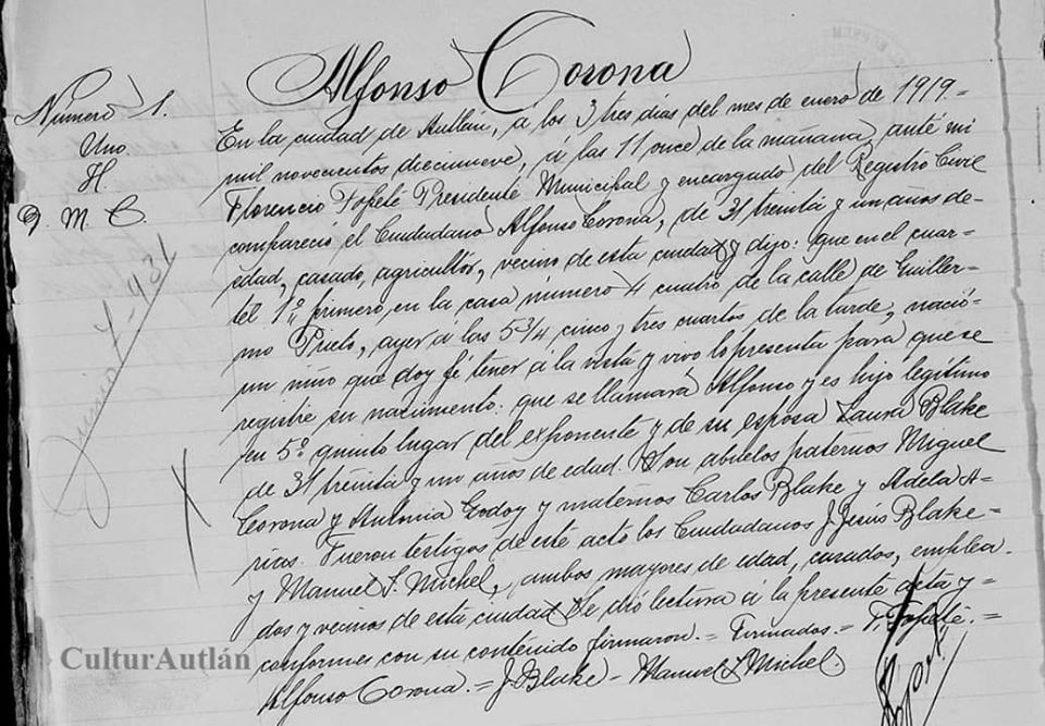 “En la ciudad de Autlán, a los 3 tres días del mes de enero de 1919 mil novecientos diecinueve, a las 11 once de la mañana ante mí, Florencio Topete, Presidente Municipal y encargado del Registro Civil compareció el ciudadano Alfonso Corona, de 31 treinta y un años de edad, casado, agricultor, vecino de esta ciudad y dijo: que en el cuartel 1° primero en la casa número 4 cuatro de la calle de Guillermo Prieto, ayer a las 5 ¾ cinco y tres cuartos de la tarde, nació un niño que doy fé tener a la vista y vivo, lo presenta para que se resustre su nacimiento, que se llamará Alfonso y es hijo legítimo en 5° quinto lugar del exponente y de su esposa Laura Blake de 31 treinta y un años de edad. Son abuelos paternos Miguel Corona y Antonia Godoy y maternos Carlos Blake y Adela Arias. Fueron testigos de este acto los ciudadanos J. Jesús Blake y Manuel S. Michel, ambos mayores de edad, casados, empleados y vecinos de esta ciudad. Se dio lectura a la presente acta y conformes con su contenido firmaron”.