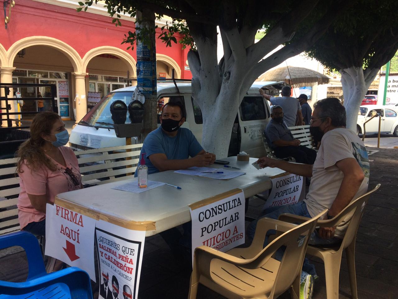 Autlán de Navarro, Jalisco. 1 de septiembre del 2020. (Letra Fría)Militantes del Movimiento de Regeneración Nacional (MORENA) instalaron en Autlán un módulopara recabar firmasy realizar juicio contra expresidentes de México, entre los que aparecen Enrique Peña Nieto, Felipe Calderón y Carlos Salinas de Gortari.