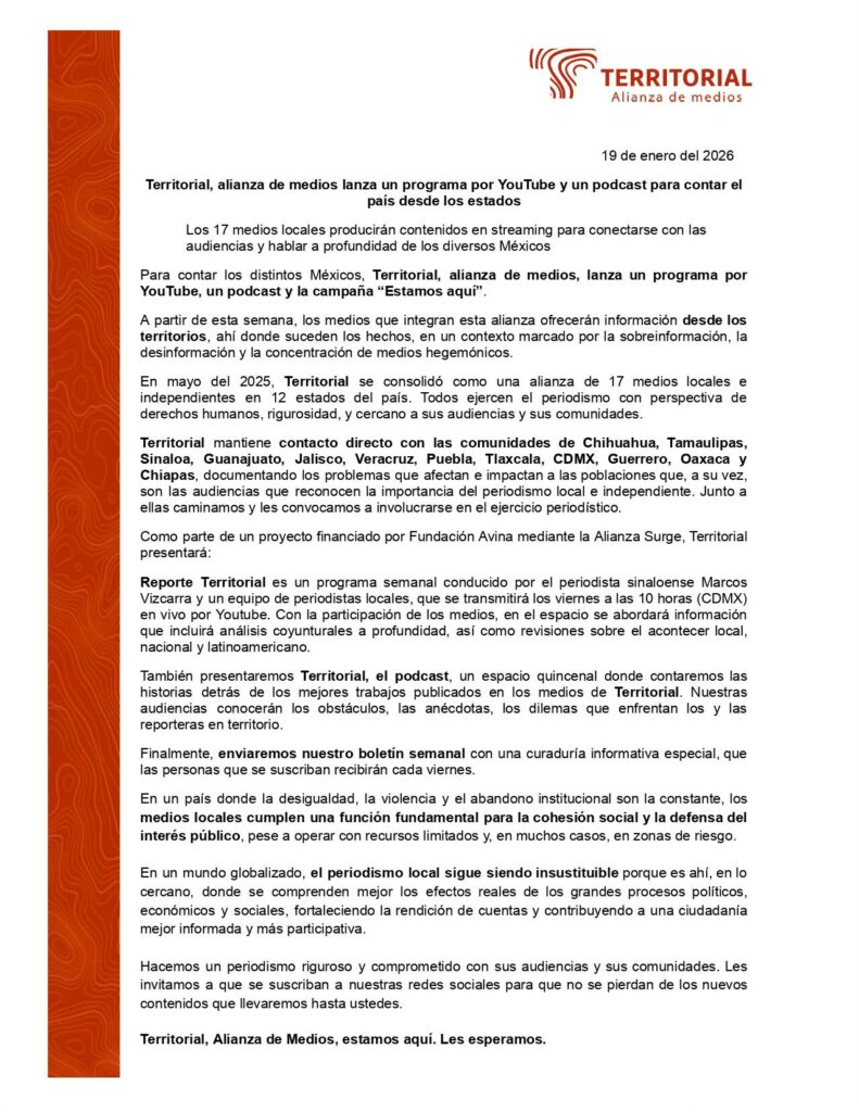 En mayo del 2025, Territorial se consolidó como una alianza de medios locales e independientes en 12 estados del país. Este esfuerzo lo integramos los medios Lado B, de Puebla; Istmo Press, El Muro y Página 3, de Oaxaca; Chiapas Paralelo, de Chiapas; Amapola, del estado de Guerrero; La Marea, de Veracruz; Zona Docs, Letra Fría y Perimetral, desde Jalisco; Revista Espejo, de Sinaloa; PopLab, de