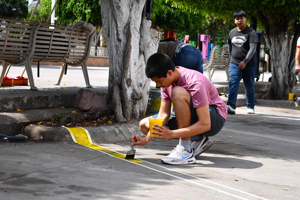 Unión de Tula, Jalisco.- Un grupo de estudiantes de la Preparatoria Regional de Unión de Tula, de la TAE de Fundamentos Básicos de Protección Civil, participó hace días en una actividad comunitaria, la pinta y señalización de espacios de estacionamiento en el primer cuadro de la ciudad.