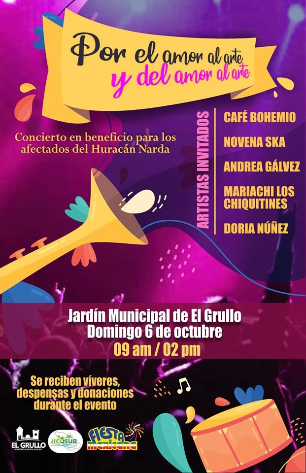 El Grullo, Jalisco. 3 de octubre del 2019. (Letra Fría) Este domingo 6 de octubre se realizará un concierto a beneficio de los afectados por la tormenta tropical “Narda” en el jardín municipal de El Grullo, a partir de las 9 de la mañana y hasta las 14:00 horas.